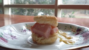 so for a shortcut I use a slice of ham which I sear in the frying pan till it’s brown on both sides. Cool a little and slice into thin slices. Layer thin slices of ham in the biscuits. It’s a great change from the same ol’ pigs in a blanket. I serve mine with a honey mustard sauce but grandma’s would have had cane syrup.