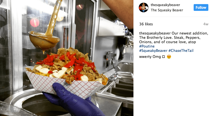 Poutine is the name of the game at Squeaky Beaver, like this massive helping of steak, peppers and onions piled on crispy fries.